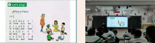 回味一:彭老师以Find a Friend歌曲开篇,既为课堂暖场,调动了孩子们的学习热情,又为接下来的My Friends主题复习课做好铺垫。可谓一举多得!